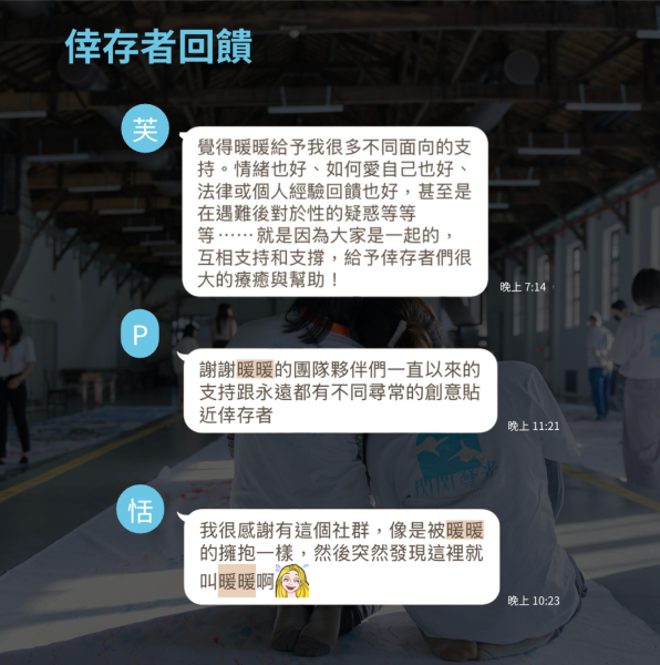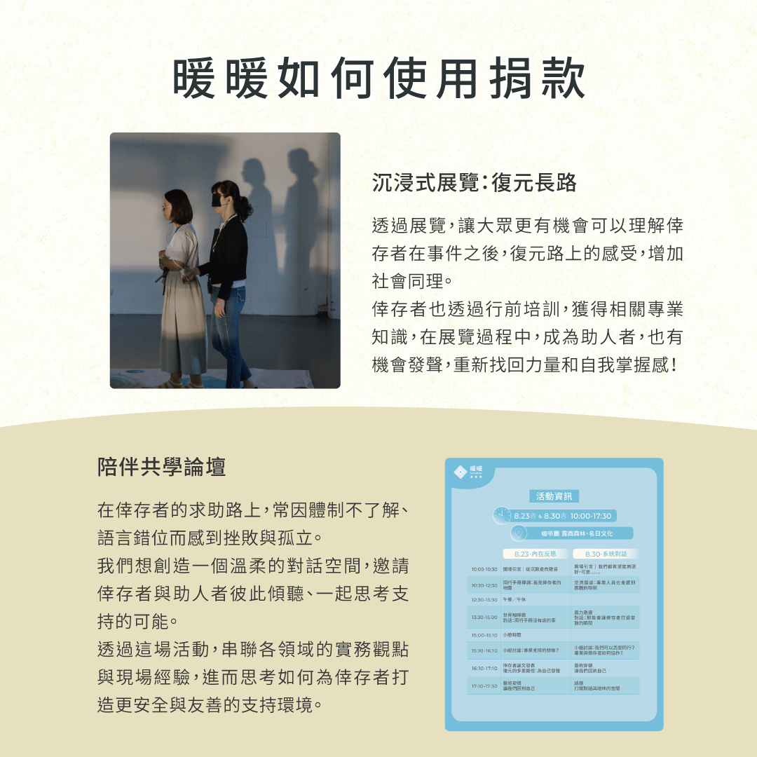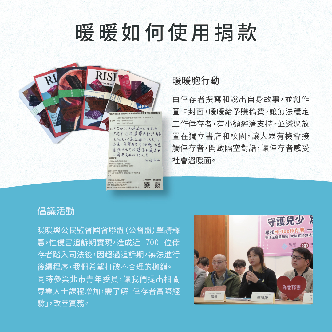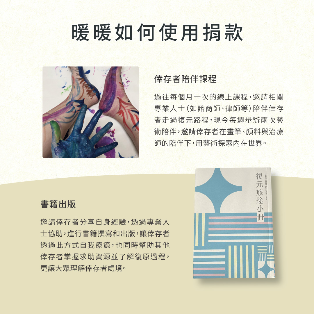 ➋ 各式倖存者支援或倡議活動:倖存者自助手冊編撰(心理師費用、顧問費用、講師費用、撰稿費用、印刷費用等)、讓更多人瞭解倖存者處境議題式藝文展覽:復元長路 2.0(製作費用)、倖存者與大眾對話:暖暖胞行動(材料印刷和寄送)、性暴力追訴期延長修憲倡議活動(人員交通費和場地費用)、倖存者與相關工作者對話:陪伴論壇(場租費用、出席費用、講師費用、印刷費用)